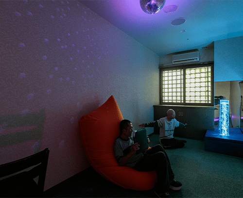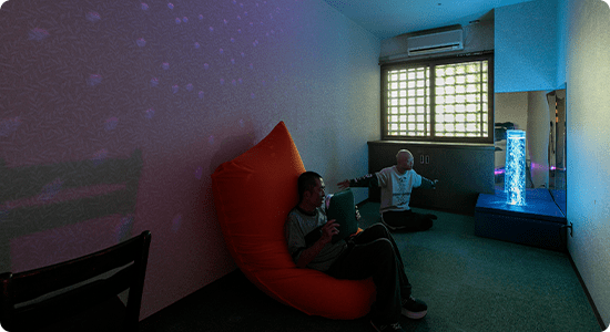 垂坂山ブルーミングハウスは「スヌーズレンルーム」を設け、視覚を刺激する照明や映像、嗅覚を刺激するアロマディフューザーのほか、体のラインに合わせて形状が変化するクッション「ヨギボー」を設置しています。